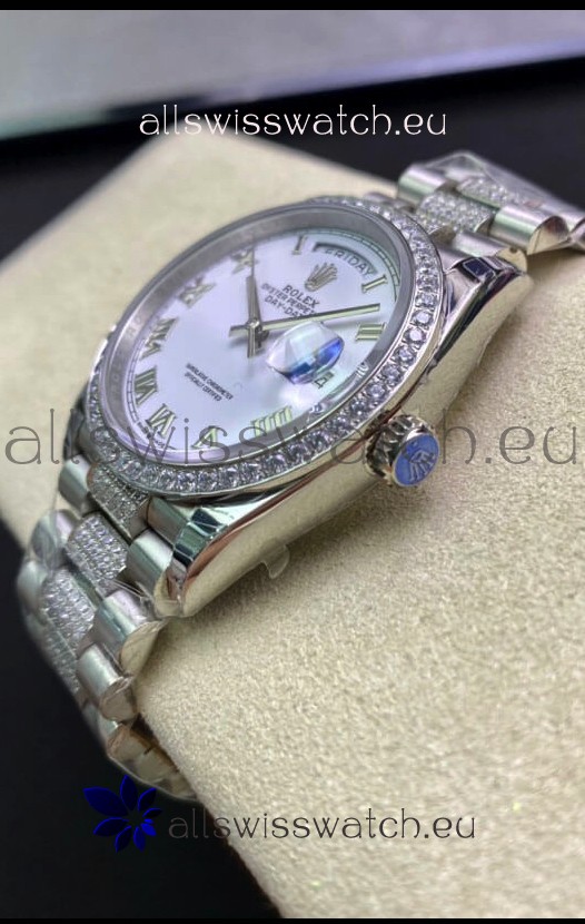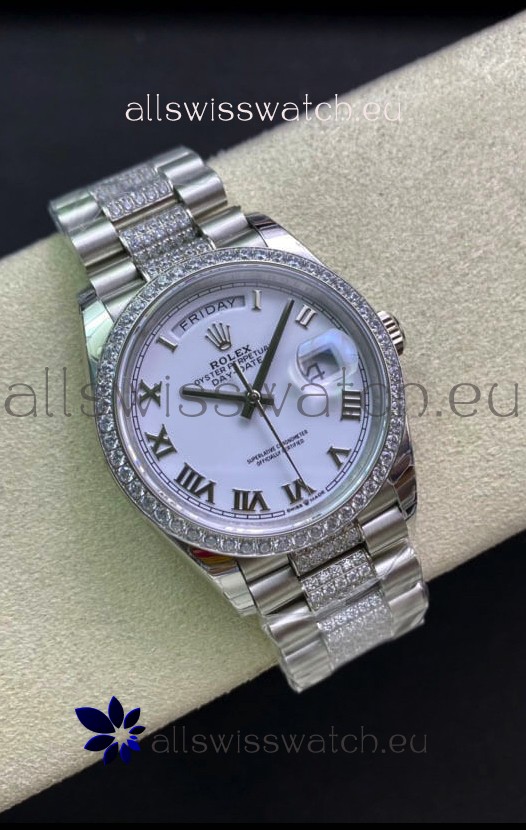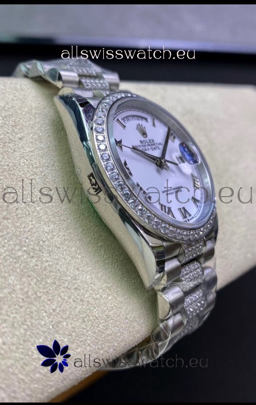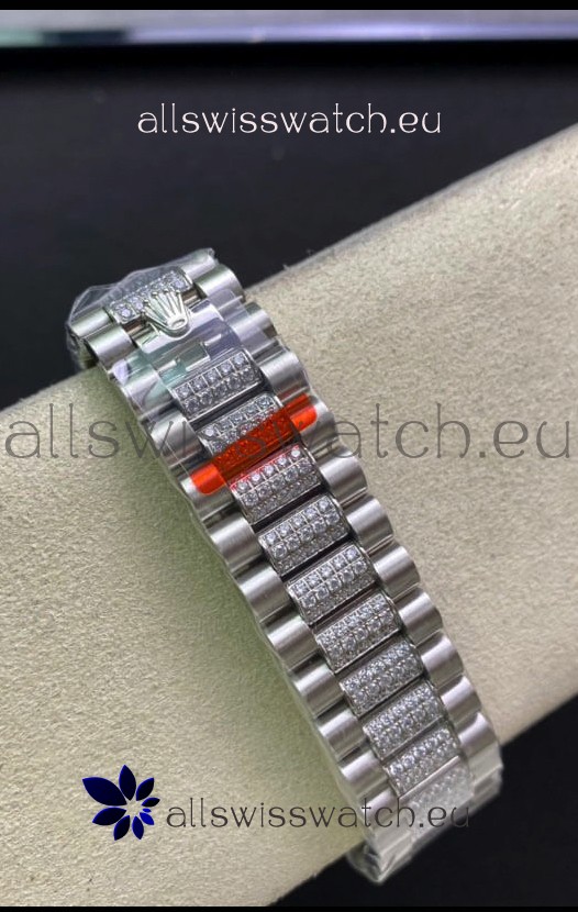 904L Stainless Steel New Design President Strap encrusted with Swiss Cut Diamonds with Folding Clasps complete with Rolex Markings and Engravings. Dismonds Encrusted in Mid-Links of Strap