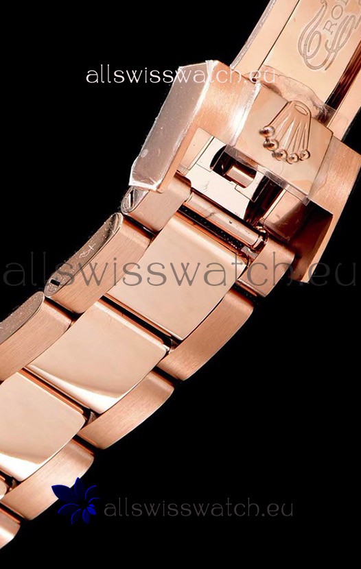 18K Rose Gold Plating on 904L Steel with New style Flip-Lock Perfectly Replicated Clasp Complete with Rolex Markings and Engravings as per the Genuine