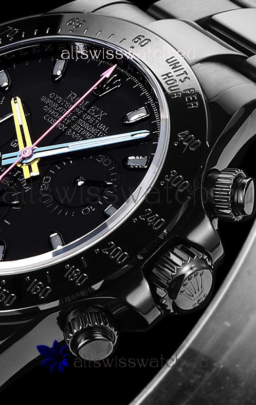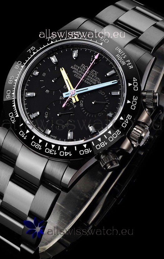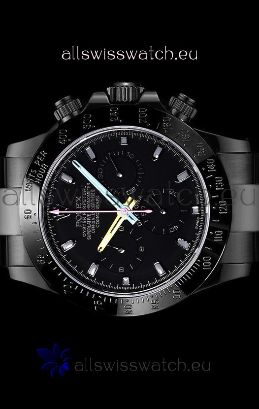 The Best Rolex Daytona Model Replicated up to Date. The First Rolex model to adopt a 904L Steel on Casing and Strap which is the same steel used by Rolex. Compared with an Original Side by Side and there were NO Differences Whatsoever. Complete list of details have been stated below and you will see that tremendous amount of detaiing and work has been put into this edition.