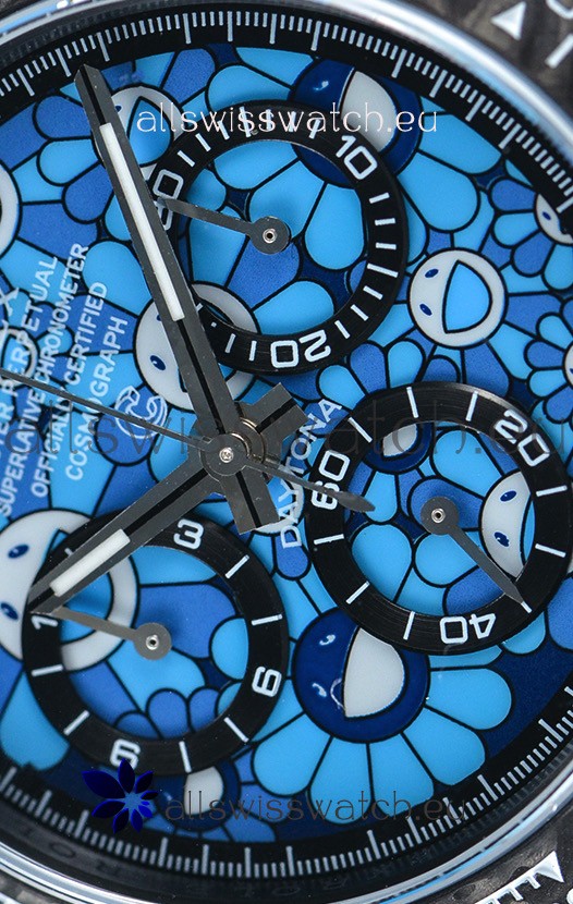 Blue Multicolored Dial with SuperLumed Hour Markers. Three Functional Sub dials working in conjunction to the stopwatch feature as per the originals.