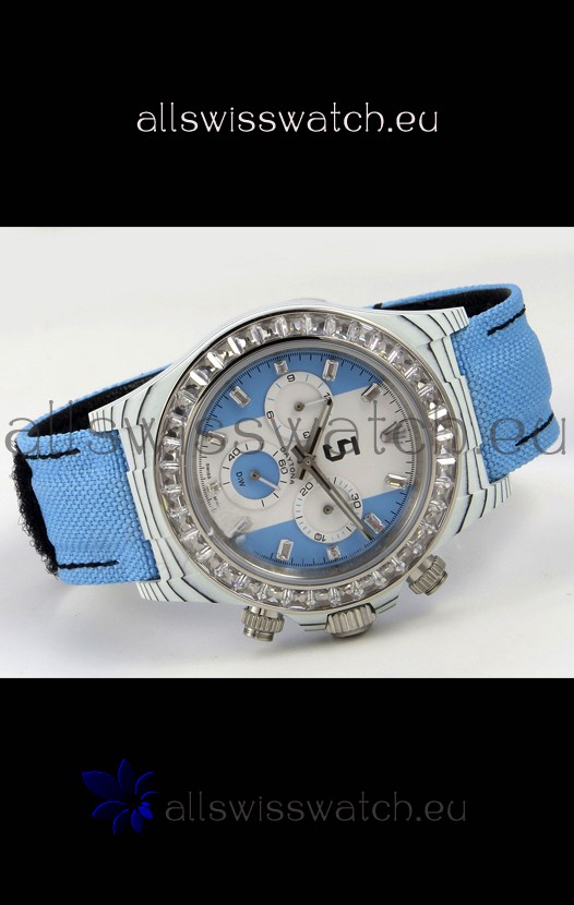 White/Blue Dial. Three Functional Sub dials working in conjunction to the stopwatch feature as per the originals. Sapphires Bezel