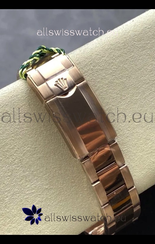 18K 10.0 Microns Thick Everose Gold Plating on 904L Solid Stainless Case with Rolex Markings and Engravings like the Authentic. High Quality Swiss Cut Diamonds on Watch Casing