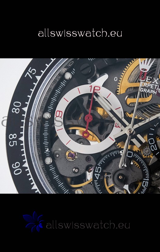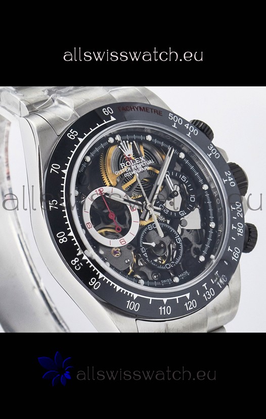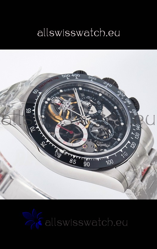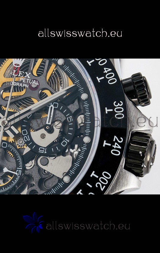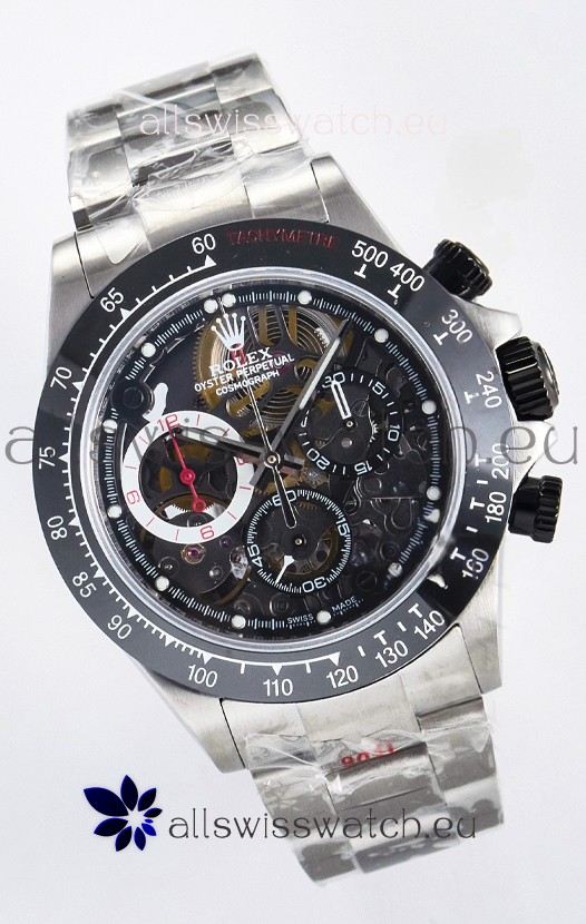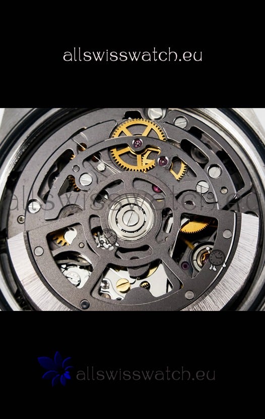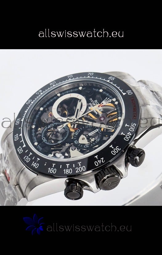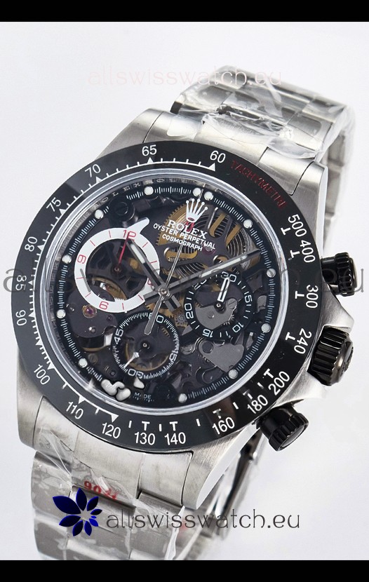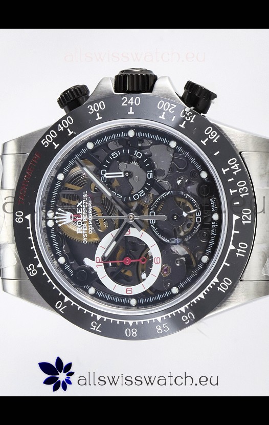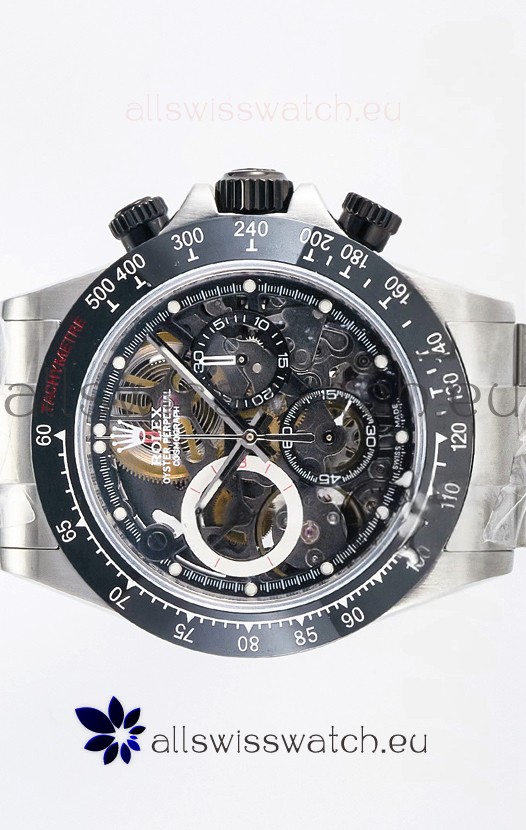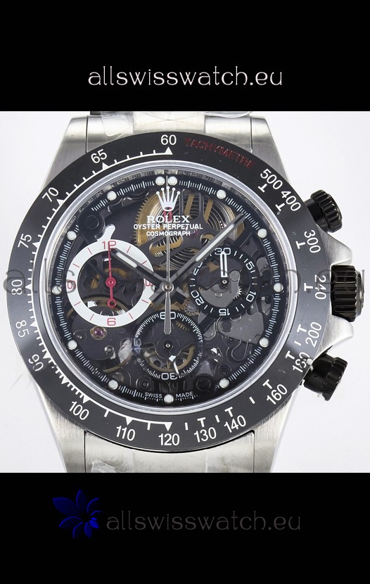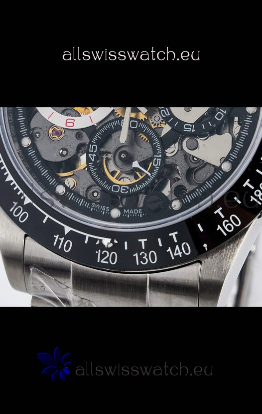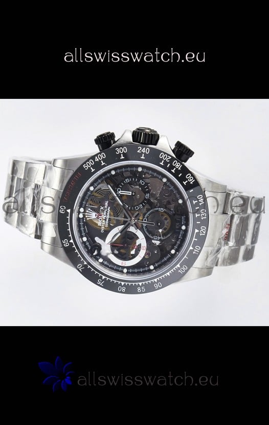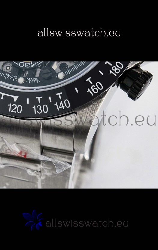 Skeleton with 3 Functional Sub Dials like the Authentic. White Scratch Proof Improved Markings Ceramic Bezel which has the same exact Fonts and Crisp marking as per the original