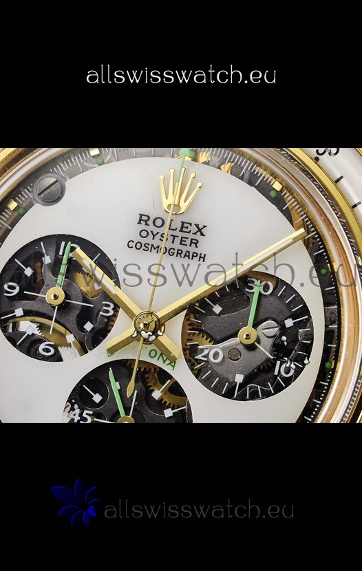Genuine Cal.4130 Movement built from Scratch with no modifications, Platinum Plating on Rotors and Plates as per the original. The Same movement you find in Rolex Daytona Watches