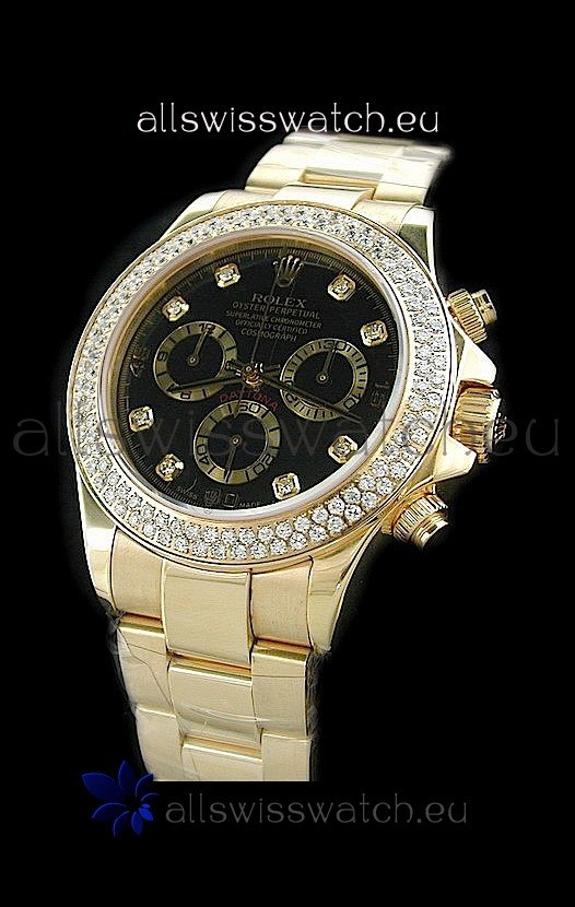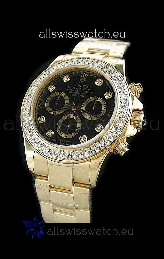 Rolex Daytona Swiss Replica Gold Watch in Full Diamond Bezel