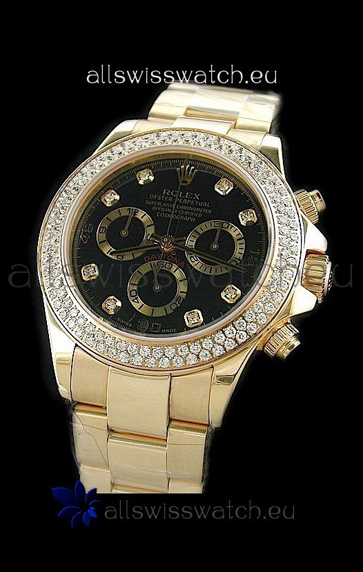You're reviewing: Rolex Daytona Swiss Replica Gold Watch in Full Diamond Bezel
