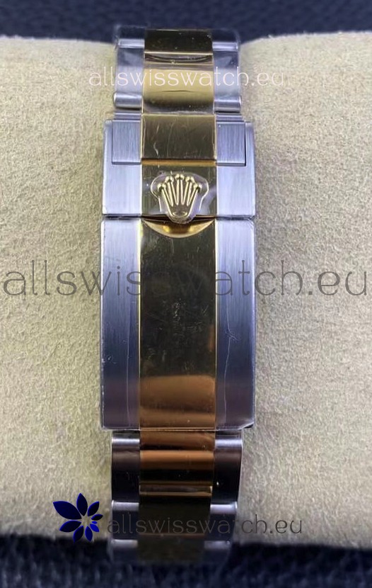 18K Yellow Gold Plating on 904L Steel Two Tone Strap with New style Flip-Lock Perfectly Replicated Clasp Complete with Rolex Markings and Engravings as per the Genuine