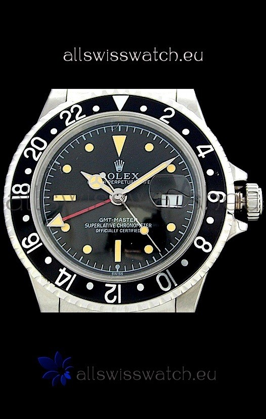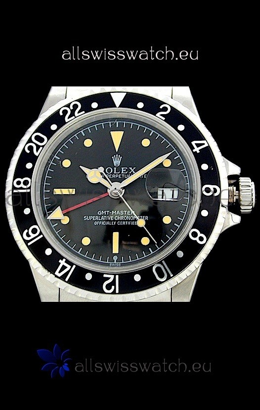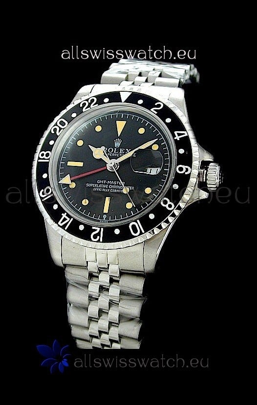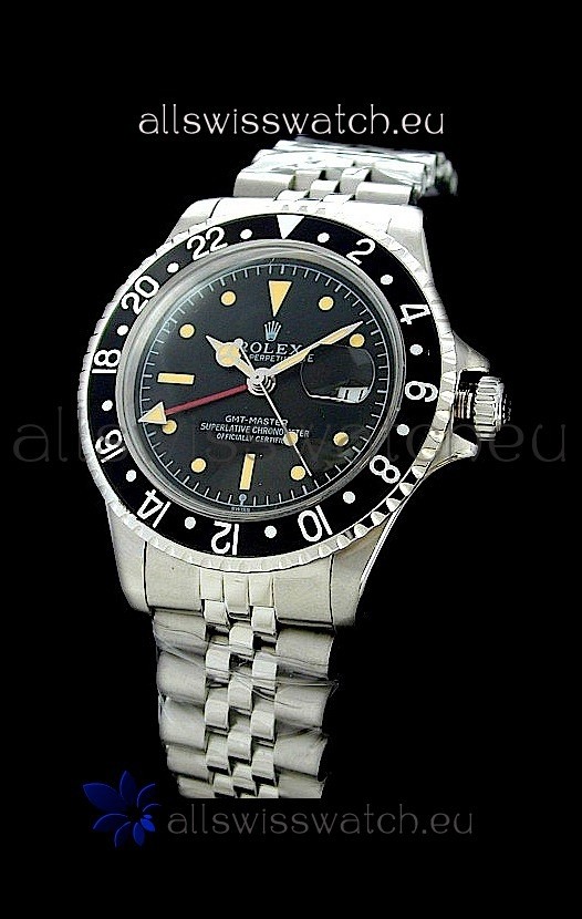 Watch name: Rolex GMT Master Swiss Replica Steel Watch in Black Bezel
