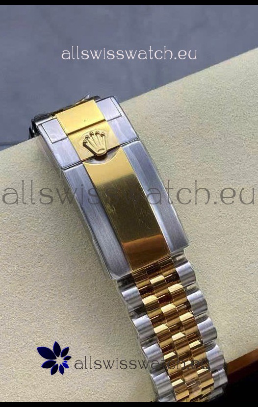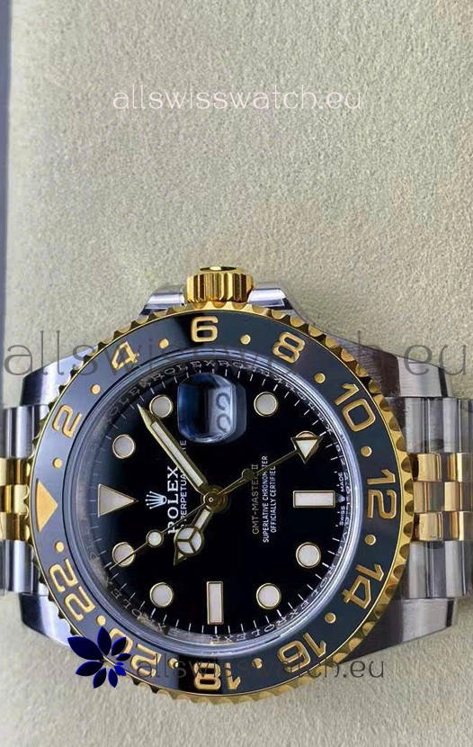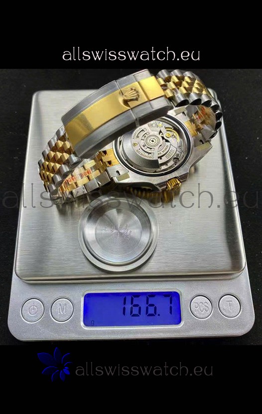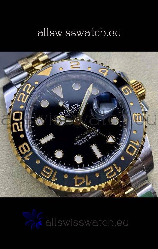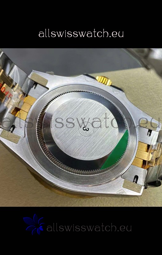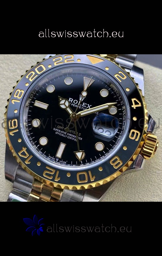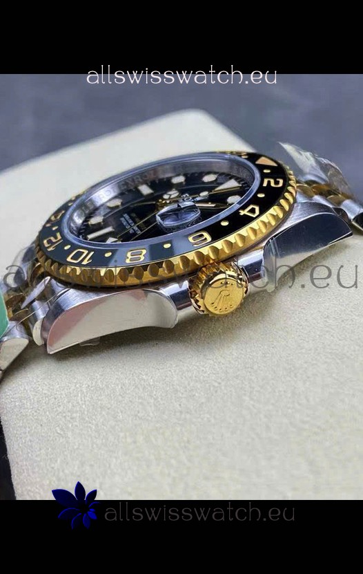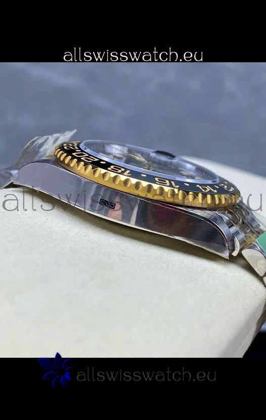 Two Tone Yellow Gold Plating 904L Stainless Steel Case as per the Orginal with Metallic Black/Blue Ceramic Inserts.