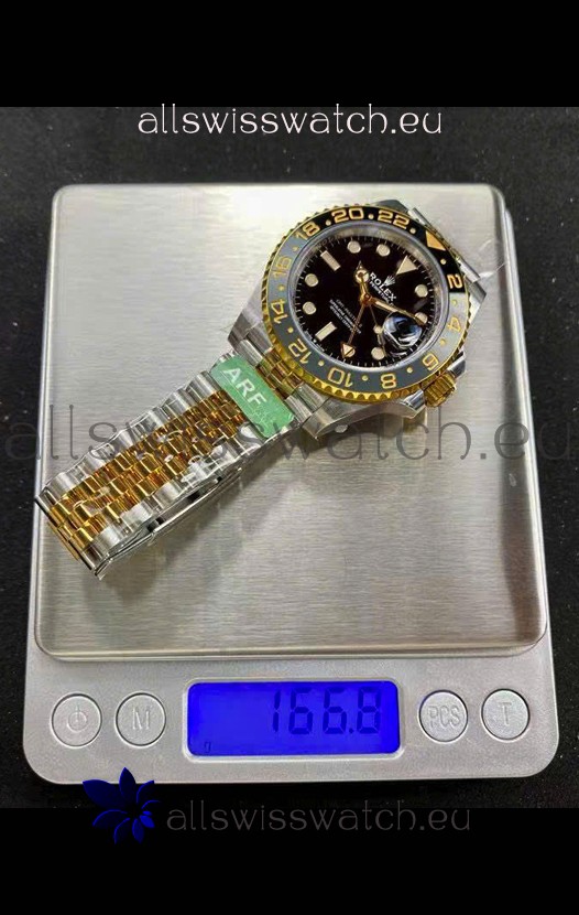 Two Tone Yellow Gold Plating. on 916L Stainless Steel Strap linked with screws, the best bracelet manufacutred up to date for the GMT Series with Flip Lock Style Clasps complete with Rolex Markings and Engravings. 2MML Lug Spring Bars with rounded heads exactly like the Original GMT Watch Straps.