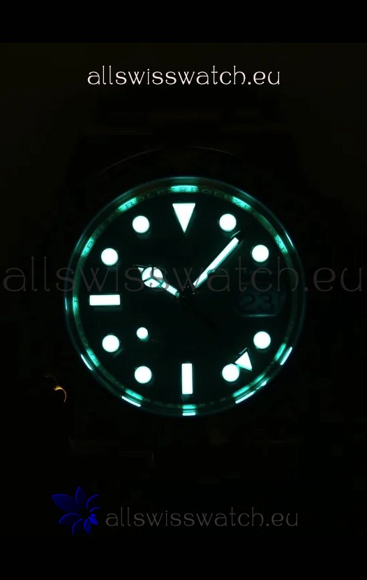 Black Dial with Super-Luminova appied to Hands, Hour Markers and Bezel Pearl. Dial Font is Crisp and is now on Par with the Originals