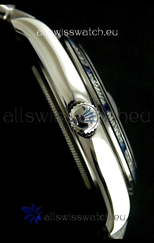 Other Feartures: Full Diamond/Blue Ruby Bezel, Solid Caseback with Rolex Hologram and Sapphire Crystal