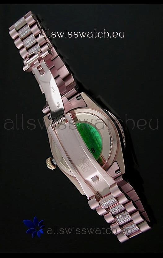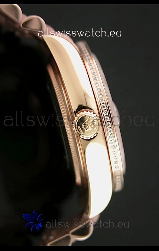Function: Rose Gold Hour, Minute, Smooth Sweeping Second Hand, High Quality Diamond Markers, Day Indicator at 12:00 and Date Window at 3:00