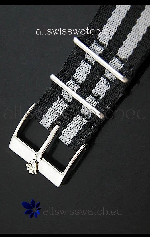 Strap: Black and Grey Military Type Nylon Strap with Tang Buckle