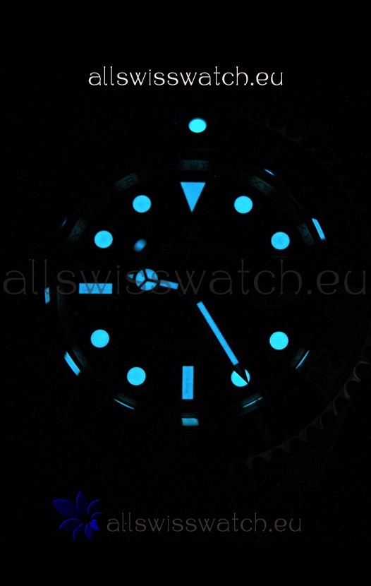 Black Dial with Super-Luminova appied to Hands, Hour Markers and Bezel Pearl. Dial Font is Crisp and is now on Par with the Originals Single Red Sea-Dweller Marking on Dial