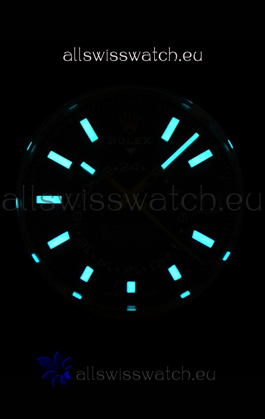 Gold Dial with Centered Sub Dial for Worldtimer Function. Super Lumed Green Hour Markers