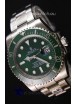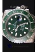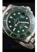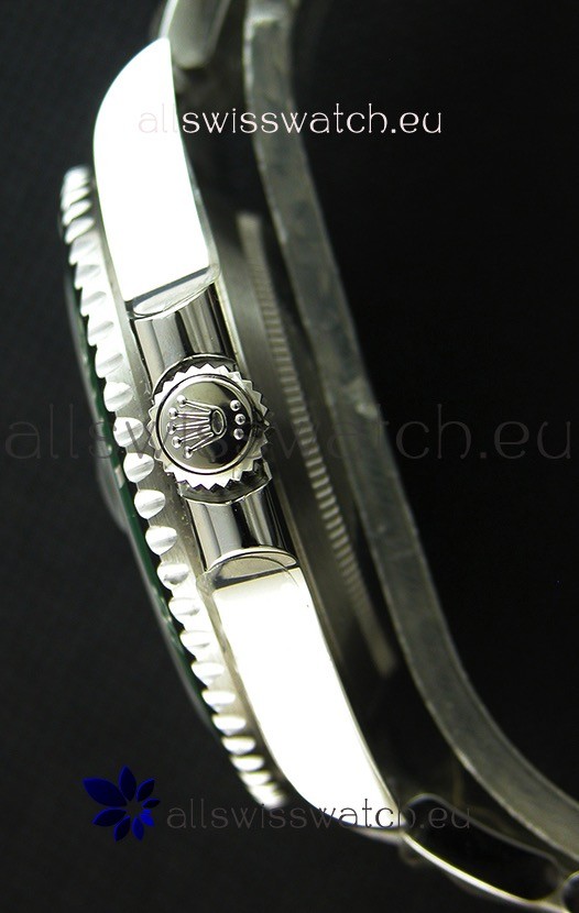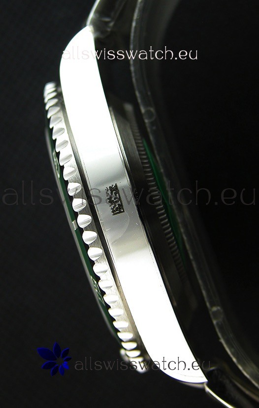 Uni-Directional Bezel with Green Ceramic Inserts with Updated Crisp Font over all previous versions. Unidirectional 120 Click Rotating Bezel with Ceramic Inserts. NEw Bezel Inserts has platinum coating applied to Dive Markers and Bezel Pearl is now Sapphire-Clad as per the Original Rolex Submariner.