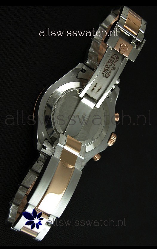18K Rose Gold Plating on 440 Solid Stainless Steel Strap linked together with Screws with Improved Rolesor Clasp with Rolex Markings and Engravings.