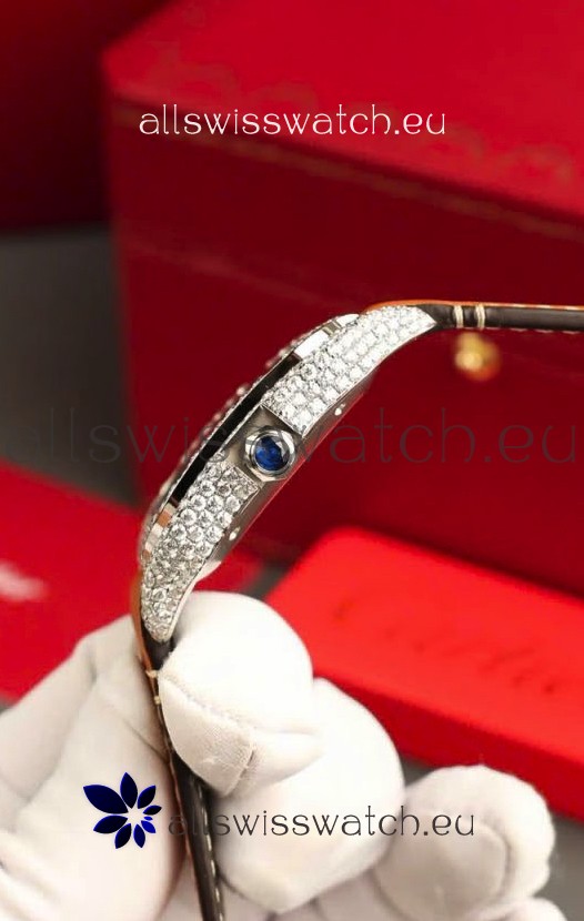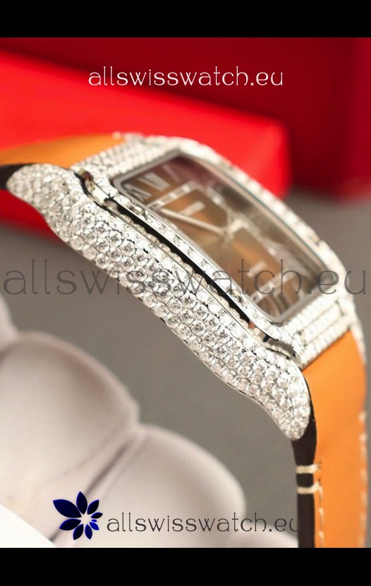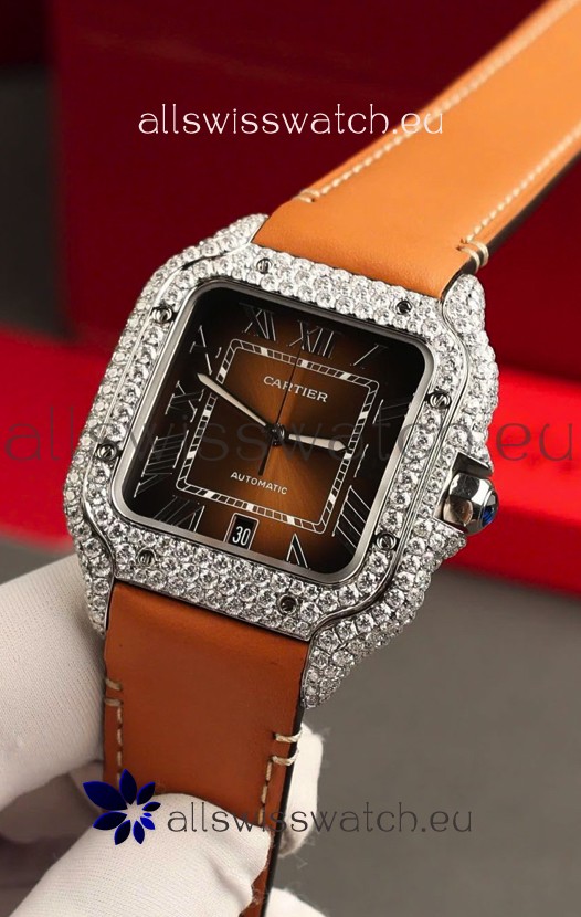 Santos De Cartier Watch in Brown Dial 39.50MM MOSSANITES Paved Bezel Swiss Replica Watch