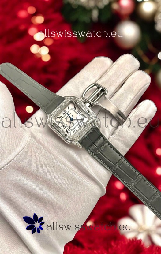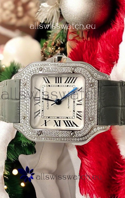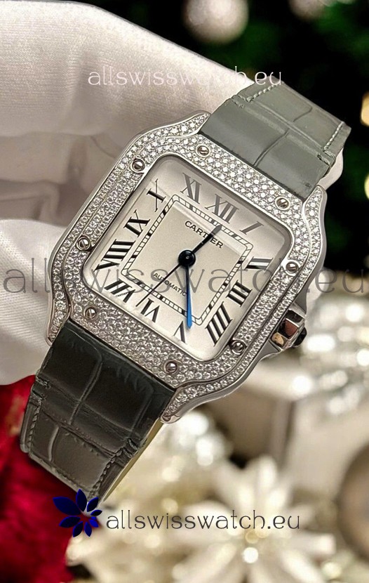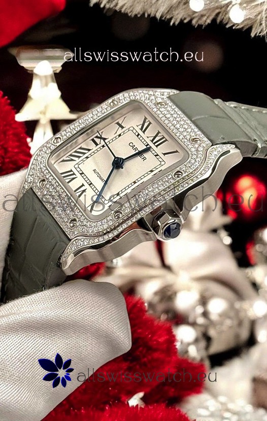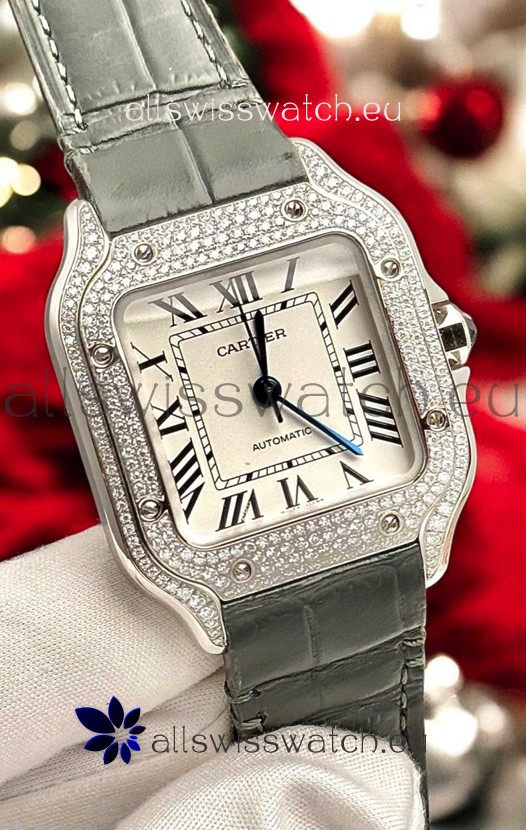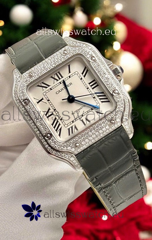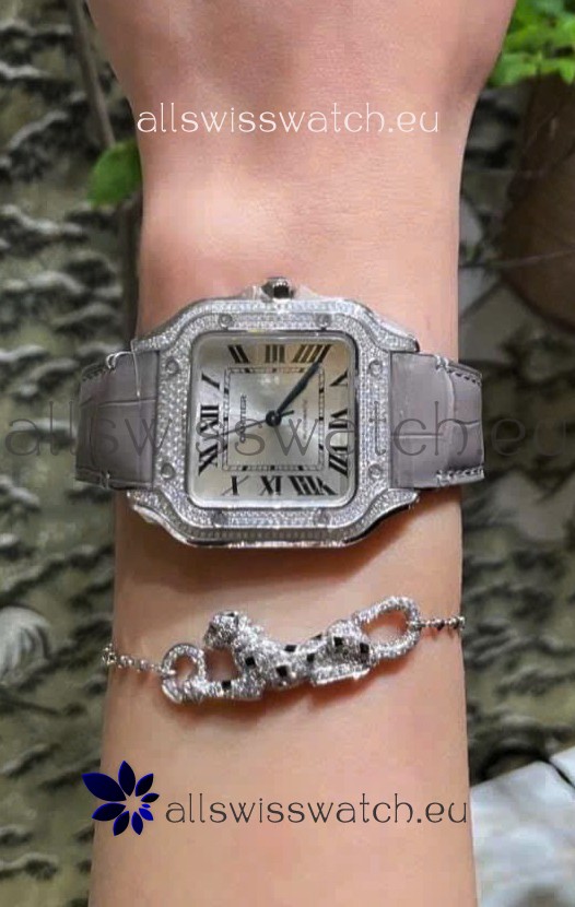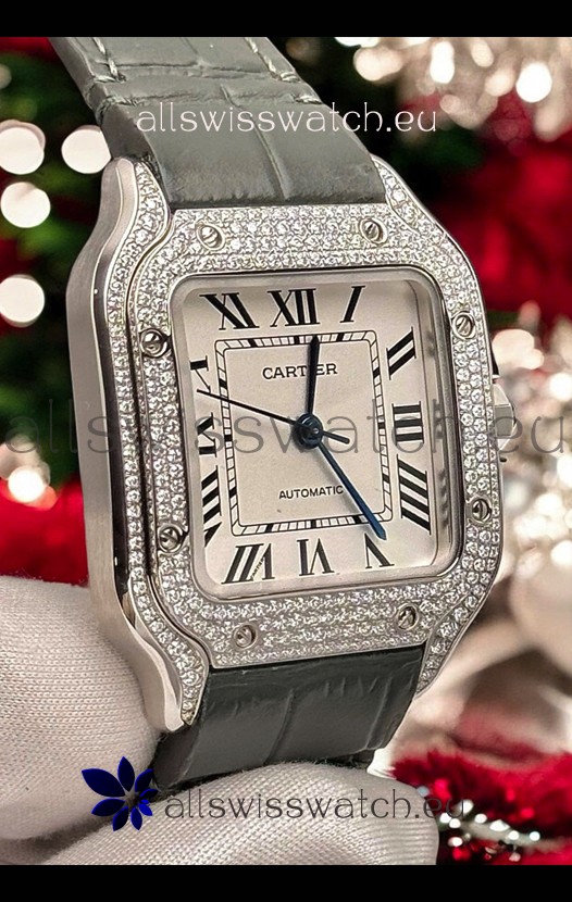Santos De Cartier Watch in White Dial 39.50MM MOSSANITES Paved Bezel Swiss Replica Watch