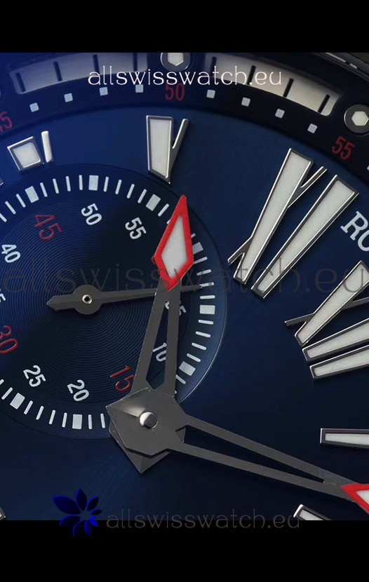 Blue Dial with Roman Hour Numerals and Date Window at 6 O'Clock. Functional Sub Dial for Seconds hands at 9 O'Clock