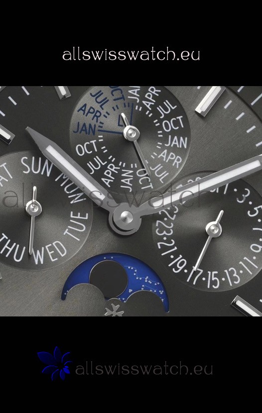 Grey Dial with Day Indicator at 9O'Clock, Month Indicator at 12 O'Clock, Date Indicator at 3 O'Clock and Moonphase Indicator at 6 O'Clock functioning at Day/Night Counters