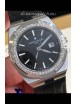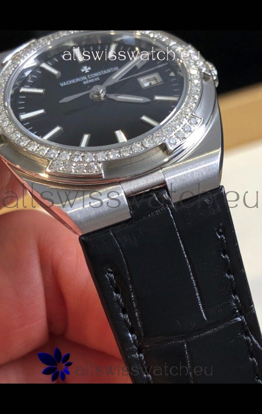 Black Dial with Date Indicator. Swiss Cut Diamonds Bezel