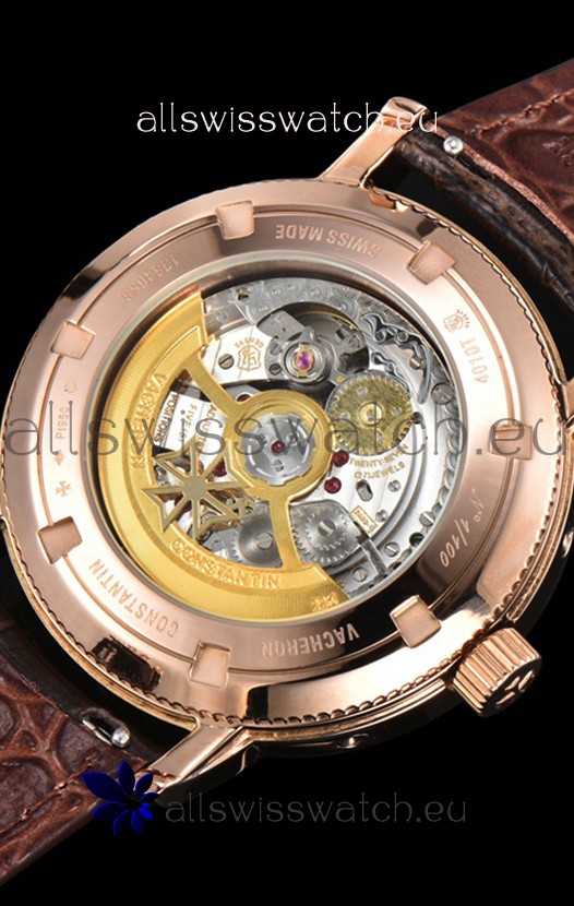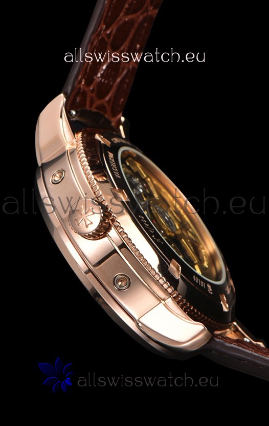 18K rose Gold Plating on 904L Solid Stainless Steel Casing complete with Vacheron Constantin Markings and Engravings. High Quality Diamonds Bezel