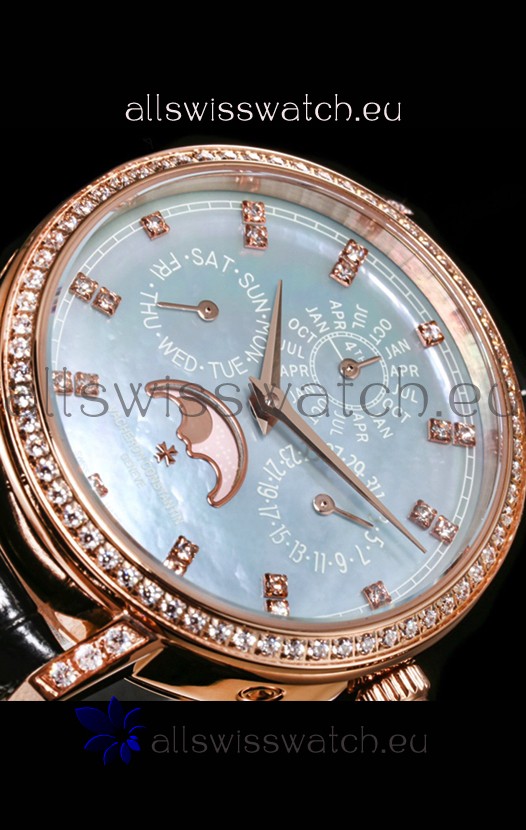 Blue Mother of Pearl Dial with Functional Month, Day and Month Indicator. Moonphase Indicator functions as Day and Night Feature
