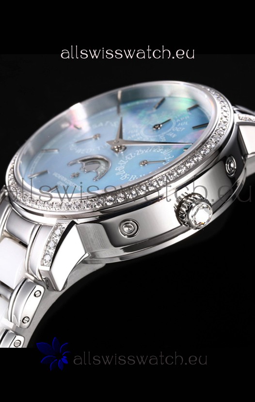 Blue Mother of Pearl Dial with Functional Month, Day and Month Indicator. Moonphase Indicator functions as Day and Night Feature