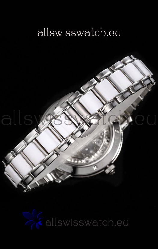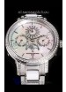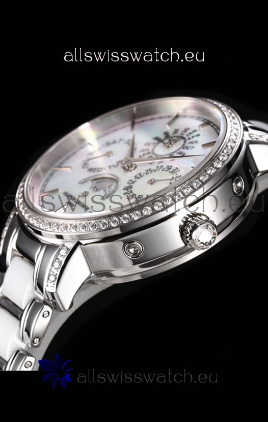 White Mother of Pearl Dial with Functional Month, Day and Month Indicator. Moonphase Indicator functions as Day and Night Feature