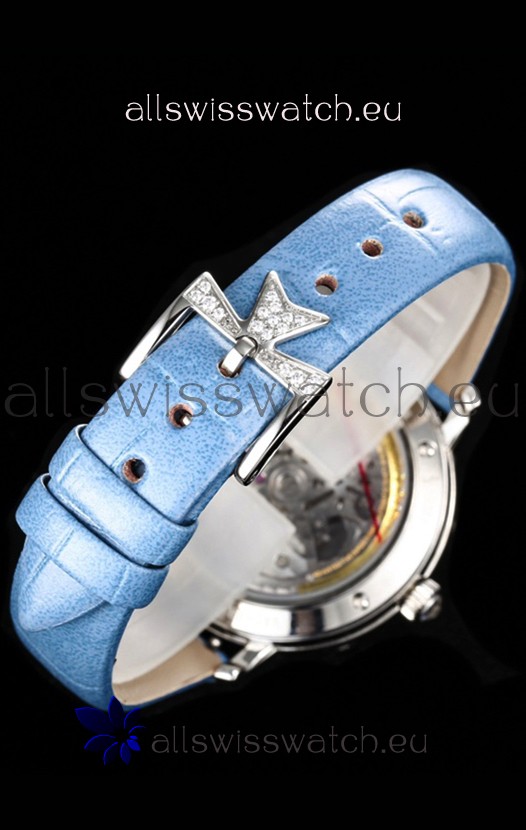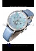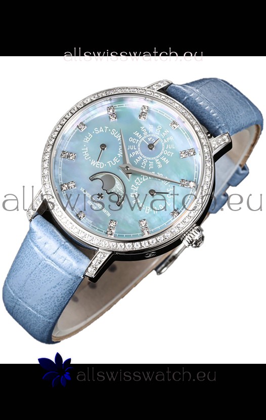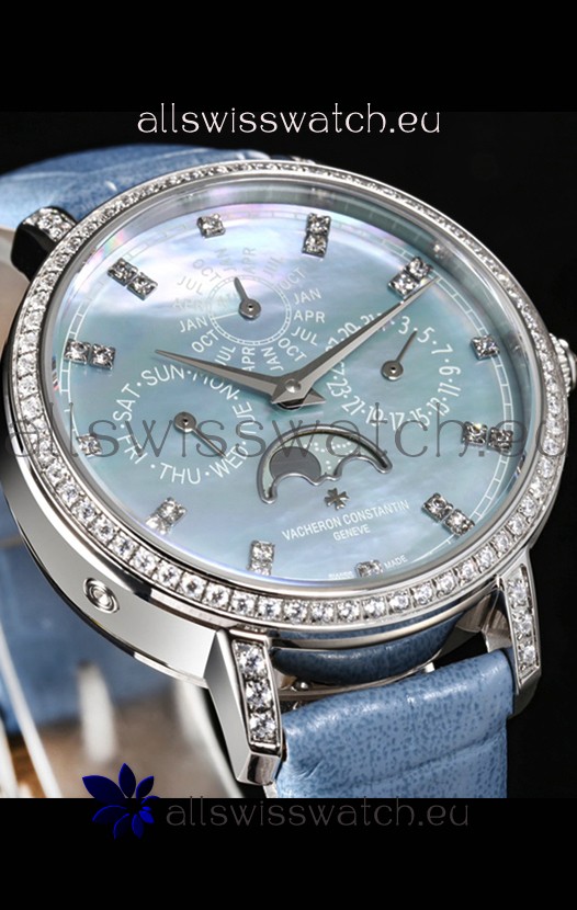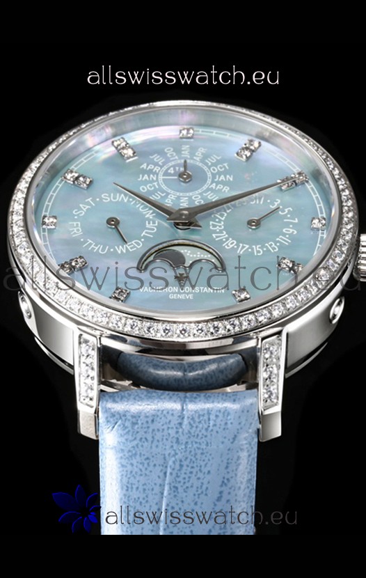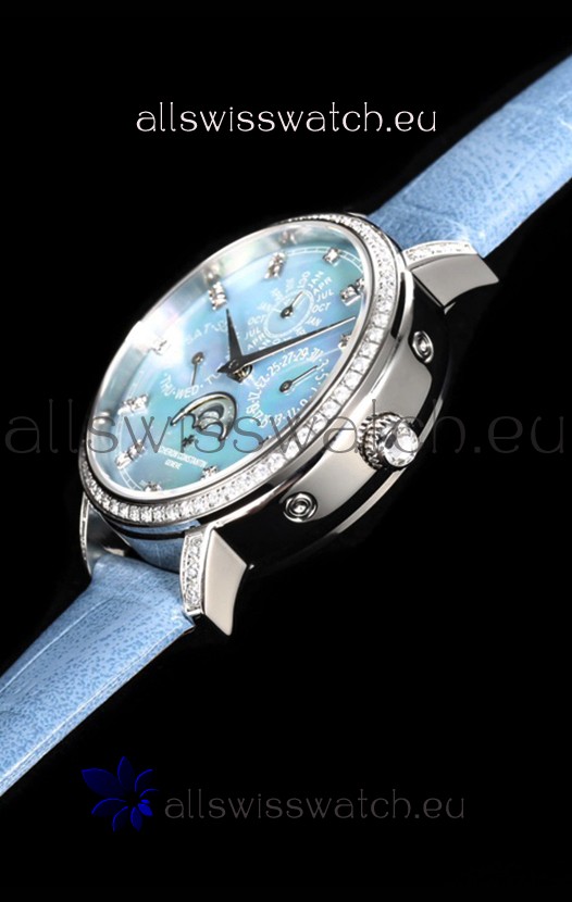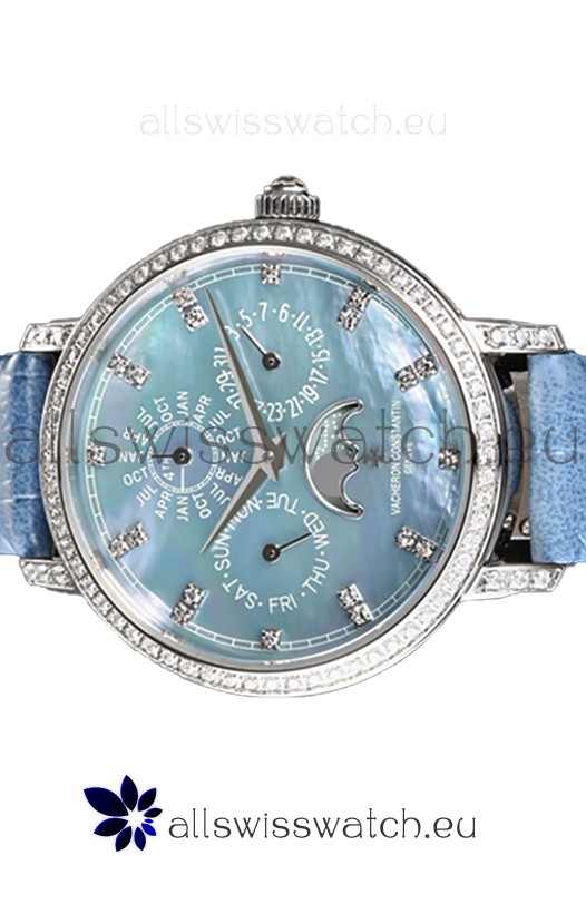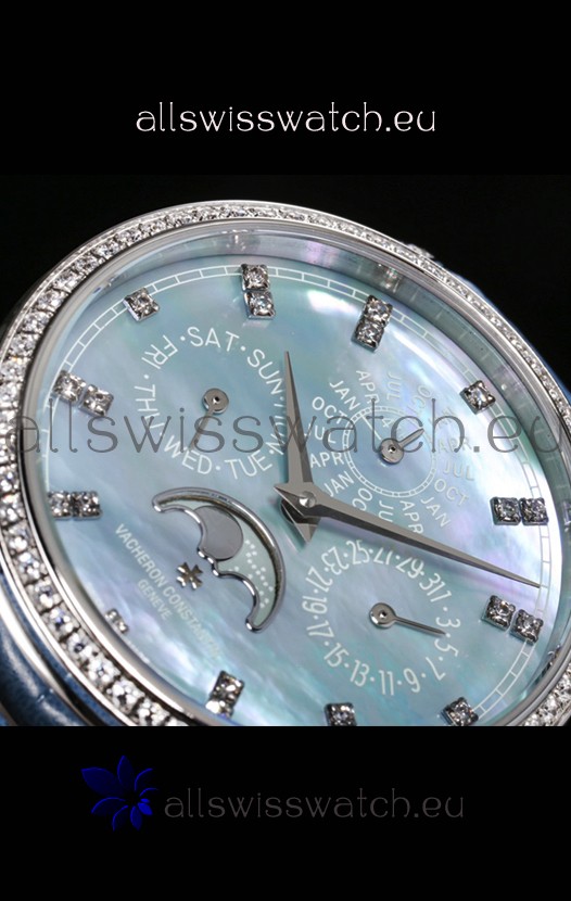 Blue Mother of Pearl Dial with Functional Month, Day and Month Indicator. Moonphase Indicator functions as Day and Night Feature