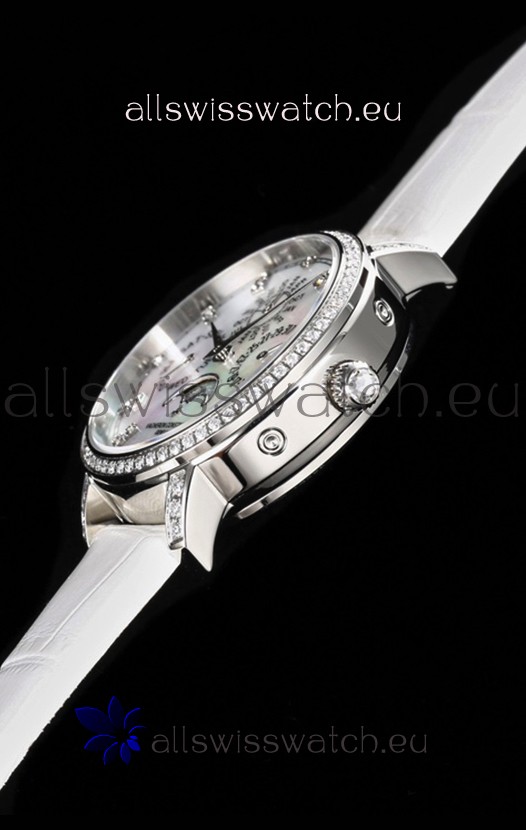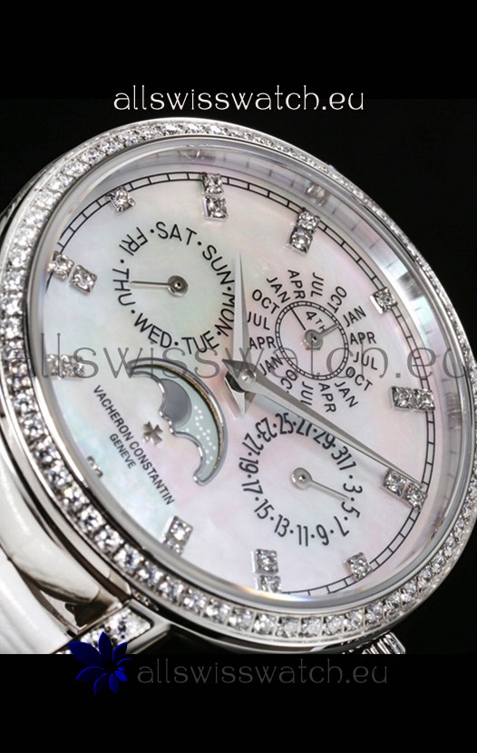 Mother of Pearl Dial with Functional Month, Day and Month Indicator. Moonphase Indicator functions as Day and Night Feature